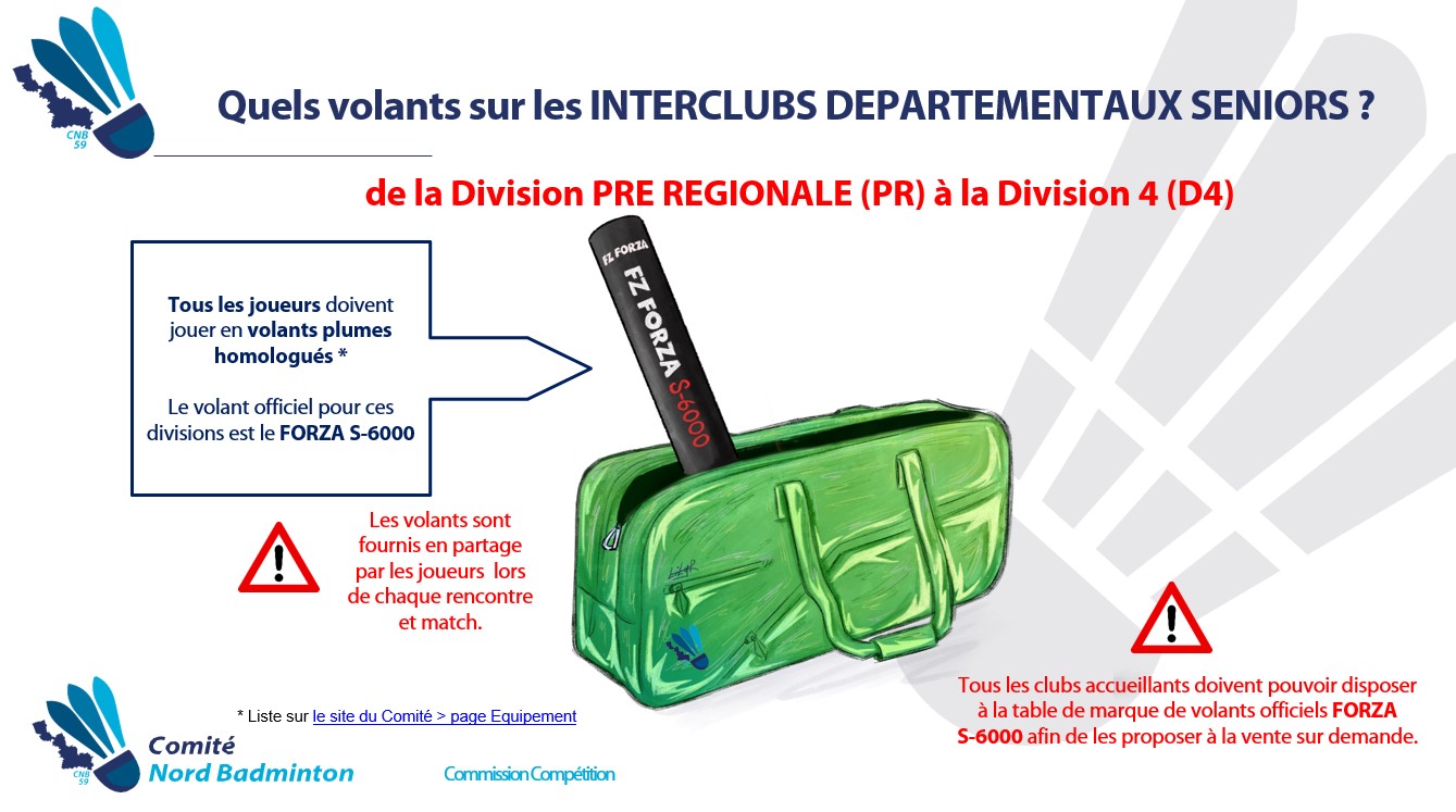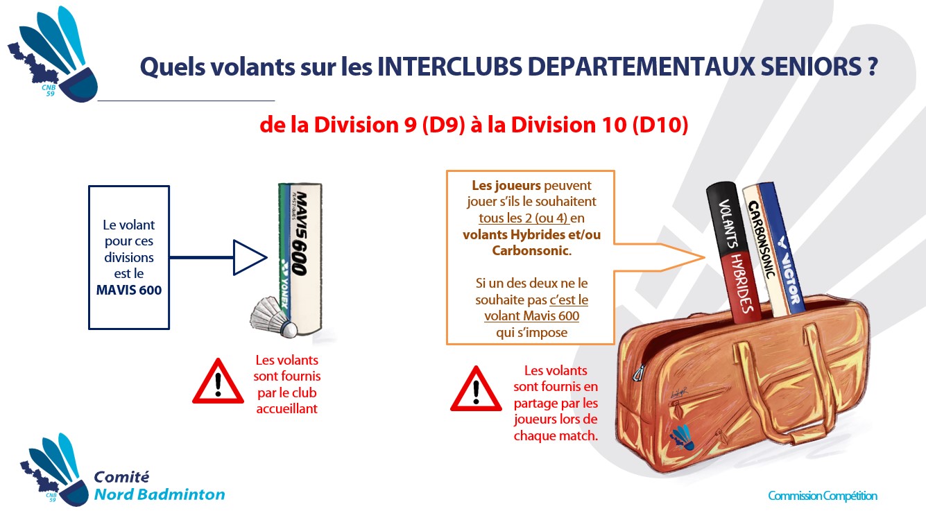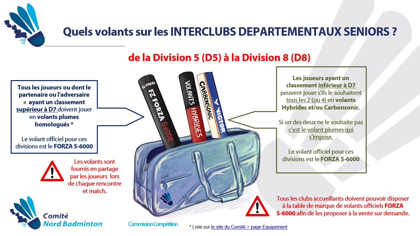 Suite aux trois premières journées des Championnats Interclubs Départementaux Seniors et à la remontée de plusieurs problèmes rencontrés par les équipes, nous souhaitons vous apporter quelques précisions concernant l’utilisation des volants dans les différentes divisions. Et comme une image vaut mieux que mille mots, en voici quatre pour vous 😉