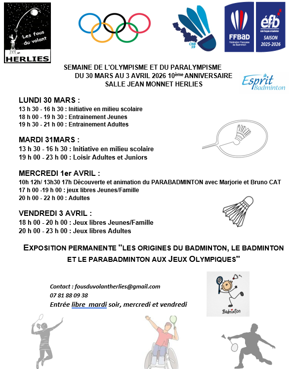 Les Fous du Volant d’ Herlies célèbrera du 30 mars au 3 avril 2026 à l’occasion de son 10ᵉ anniversaire de la Semaine de l’Olympisme et du Paralympisme.