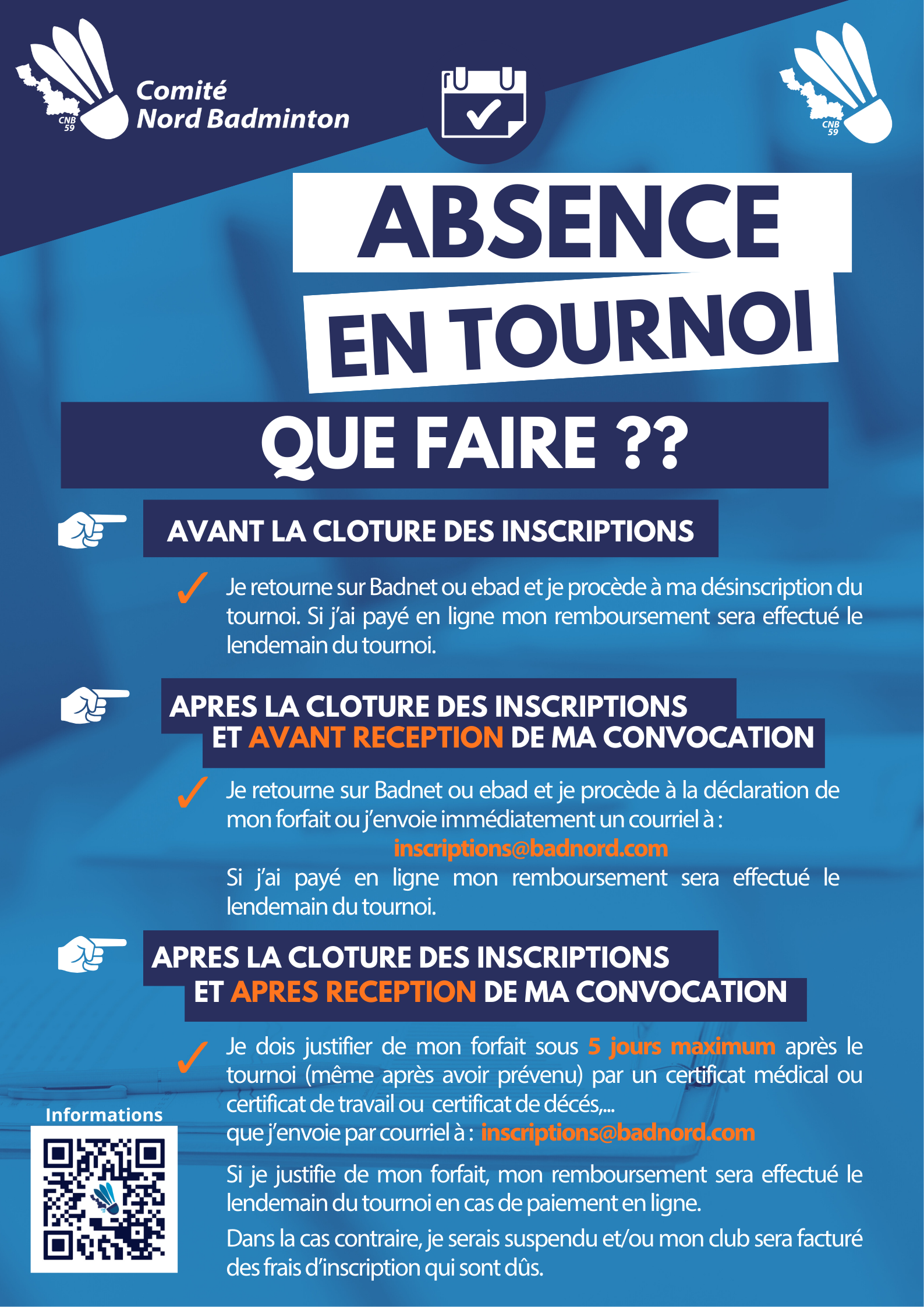 Depuis plusieurs mois, le Comité Départemental du Nord constate une augmentation significative des forfaits et absences non justifiées lors des tournois départementaux. Ce phénomène, qui semblait autrefois ponctuel, prend désormais une ampleur préoccupante, perturbant le bon déroulement des compétitions. Sur la page « Justifier son forfait » du site BadNord, il est clairement rappelé que tout joueur inscrit à une compétition et